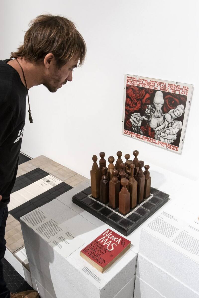 En rojo, descansa el libro "Nunca Más", el informe de la Comisión Nacional sobre la desaparición de las personas durante el gobierno militar. A su lado, una muestra del proyecto "Baldosas de la Memoria" en La Plata, de Pablo Ungaro y Florencia Thompson, que señala los sitios donde fueron secuestradas y asesinadas personas durante esos años de terrorismo de Estado. Caras, nombres y palabras de sus familiares.