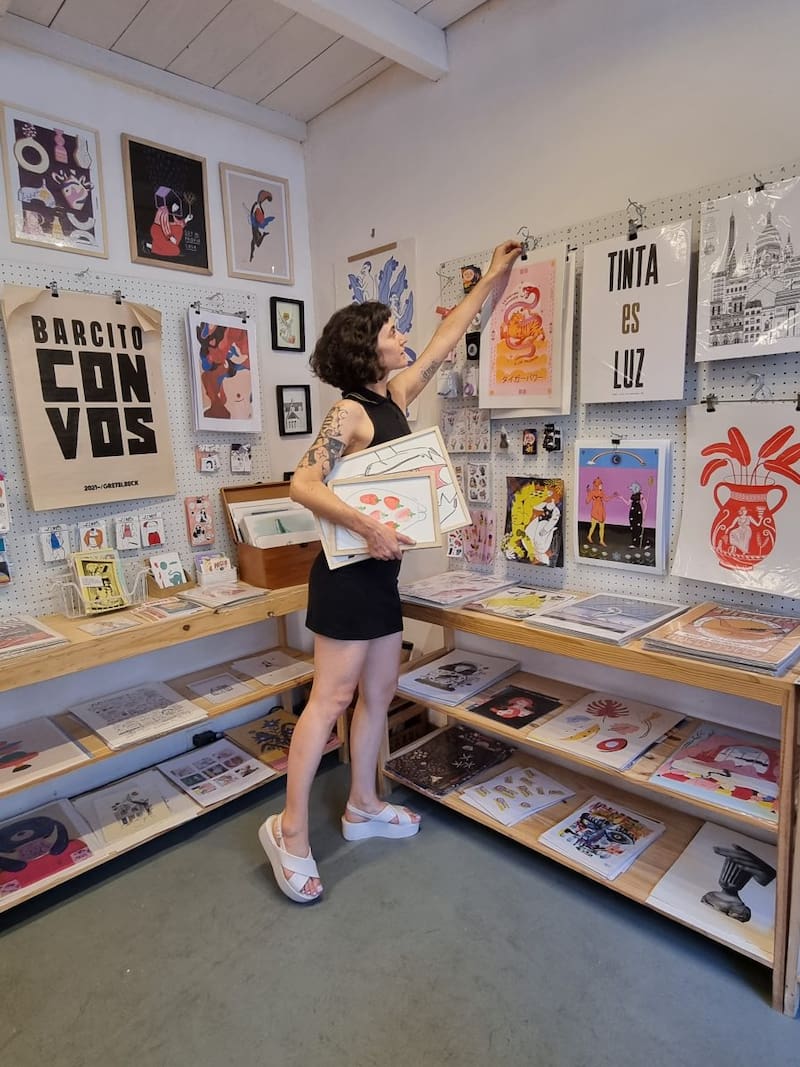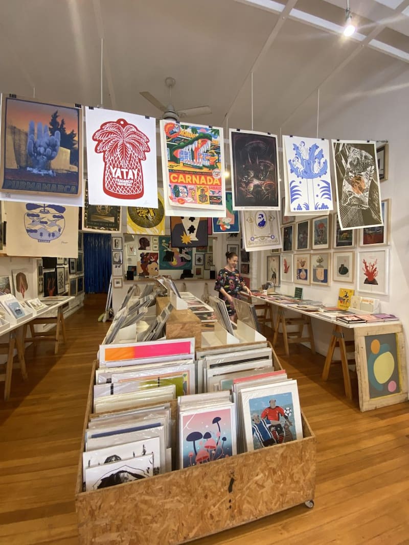 Hay muchas técnicas de elaboración y de impresión en las obras que exhiben. Hay obras impresas en serigrafía, en risografía, prints digitales, afiches impresos con tipos móviles, obras originales en acuarela, en collage, cianotipo, stickers, pins y un poquito de cerámica también. De ahí varían también los precios; no vale lo mismo una obra original (la pintura auténtica) que una reproducción digital, que es mucho más accesible. "Eso se lo contamos siempre a la gente, para que sepan lo que se están llevando", comenta su creadora. Porque, por más de que salgas con las manos vacías, si estás abierto a conocer y curiosear, te podés ir con mucha información. "Nosotras sabemos mucho de la técnica y de quién es cada obra y cómo está hecha, conocemos la historia detrás de casi todas las obras. Si la persona está dispuesta, además del arte se lleva una historia detrás, y eso está muy bueno".