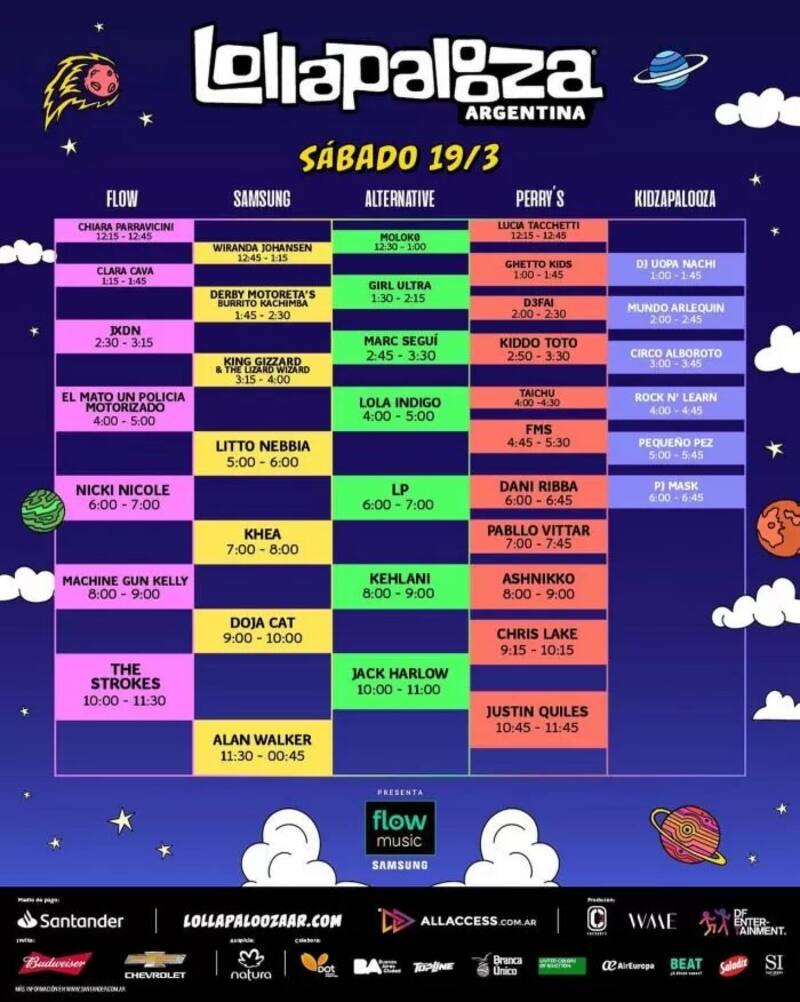 Este sábado 19 continúa con The Strokes, Doja Cat, Machine Gun Kelly, Jack Harlow, Alan Walker, Khea, Kehlani, Nicki Nicole, Justin Quiles, LP, Litto Nebbia, Él Mató a un Policía Motorizado, Chris Lake, King Gizzard & the Lizard Wizard, Ashnikko, Dani Ribba JXDN, FMS, Natanael Cano, Pabblo Vittar, Marc Seguí. Derby Motoreta's Burrito Kachimba | Taichu, Kiddo Toto, Clara Cava, Girl Ultra, Ghetto Kids, Molok0, Chiara Parravicini, wiranda johansen, Lucia Tacchetti y D3FA.