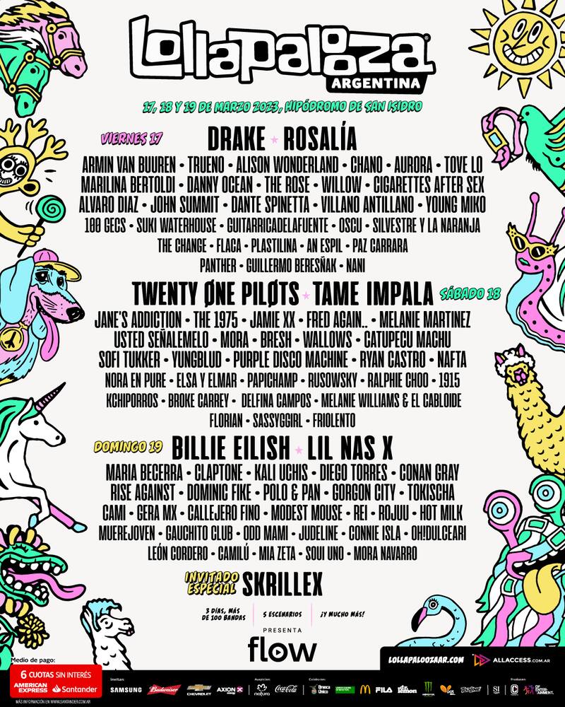 TWENTY ONE PILOTS / TAME IMPALA / JANE´S ADDICTION / THE 1975 / JAMIE XX / FRED AGAIN / MELANIE MARTINEZ / USTED SEÑALEMELO / MORA / BRESH / WALLOWS / CATUPECU MACHU / SOFI TUKKER / YUNGBLUD / PURPLE DISCO MACHINE / RYAN CASTRO / NAFTA / NORA EN PURE / ELSA Y ELMAR / PAPICHAMP / RUSOWSKY / RALPHIE CHOO / 1915 / KCHIPORROS / BROKE CARREY / DELFINA CAMPOS / MELANIE WILLIAMS & EL CABLOIDE / FLORIAN / ANGELA TORRES / SASSYGGIRL / FRIOLENTO