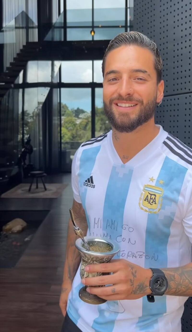 A través de su cuenta de Instagram, Maluma anunció su regreso al país con la camiseta de la Selección argentina puesta y un mate en la mano. "¿Estamos listos? Argentina, ¿estamos listos?", preguntó.