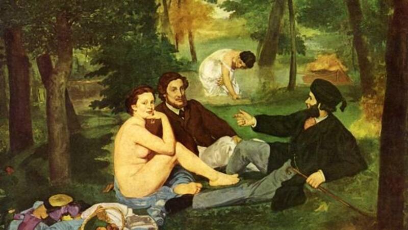 Decía que el mayor pintor de la historia era don Diego de Silva y Velázquez, y coincidimos con él. Viajó a España durante tan solo diez días pero la pintura hispana caló fuerte en sus entrañas. Baudelaire y Zola, los grandes escritores de la época, fueron sus amigos y lo admiraban. En 1865 se produce el primer "escándalo", le rechazan su obra "Almuerzo en el Parque" y es expuesta en el Salón de Rechazados. Tanto se comenta la obra que su nombre comienza a ser conocido. Una lindísima mujer desnuda está de pícnic con dos señores muy bien vestidos y una compañera que está en el fondo, esto daba a entender que en los parques públicos de París había sexo y no se lo quería admitir.