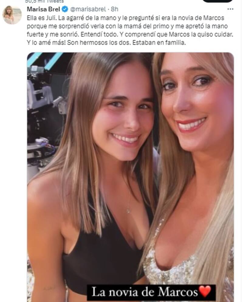 La noche anterior, la panelista subió una foto de la joven con la leyenda: "Ella es Juli. La agarré de la mano y le pregunté si era la novia de Marcos porque me sorprendió verla con la mamá del primo. Me apretó fuerte la mano y me sonrió", inició Brel, y remarcó: "Son hermosos los dos".