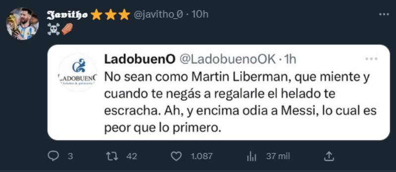 "No aceptamos darle publicidad. No sean como Liberman, que cuando negás a regalarle el helado te escracha", decía la publicación Eladobueno.