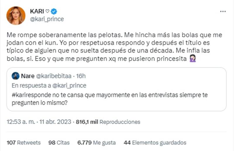 Luego de que la declaración se volviera viral, Karina abrió un espacio para responder las preguntas de sus seguidores y poder expresar su molestias. En este marco, un joven le consultó: ¿No te cansa que mayormente en las entrevistas siempre te pregunten lo mismo?