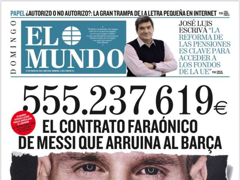 La publicación reveló en su tapa que el astro firmó en noviembre de 2017 "un documento que le otorga hasta 138 millones de euros por temporada entre fijo y variable". Según el medio, Messi percibiría un total de 555 millones (u$s 675 millones) por cuatro temporadas.