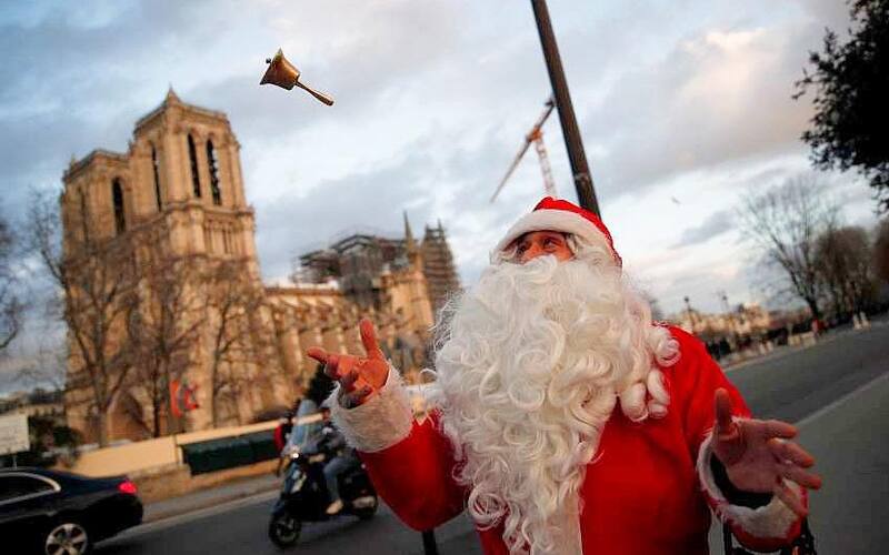Un Papá Noel posa para los turistas y lanza su campana al aire frente a la Catedral de Notre Dame en París.
