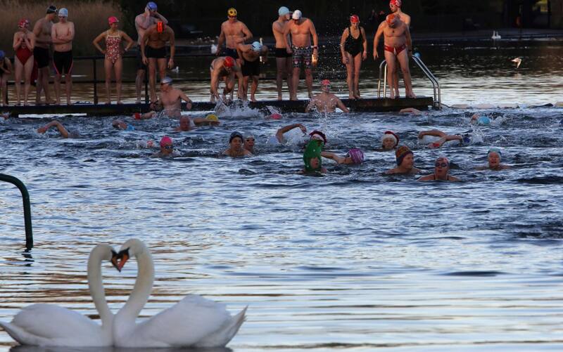 Nadadores participan en la carrera de la Copa Peter Pan, que se celebra cada Navidad en Hyde Park, en Londres.