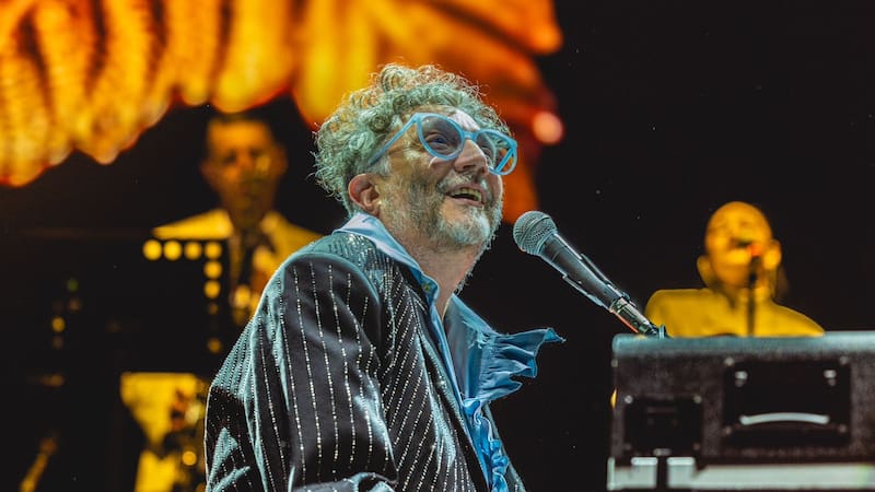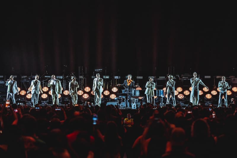 Una vez más, Fito Páez se convirtió enun director de orquesta que guiaba a nueve músicos: dos guitarras, dos teclados, un bajo, una sección de vientos conformada por trompetas, saxos y trombón, sumado a un coro de voces que hicieron del show un templo. Mientras él, repasaba, una por una, las canciones que conforman el track-list de cada álbum.