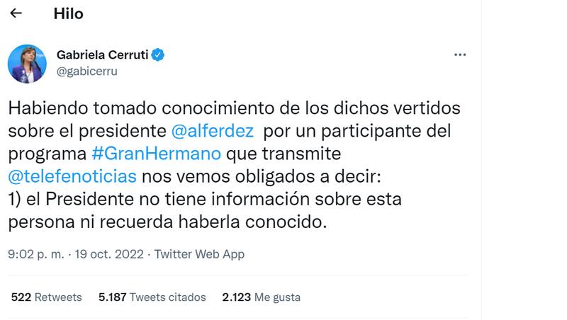 La secretaria de Comunicación y Prensa del Gobierno publicó una serie de tuits donde, remarcó que "el Presidente no tiene información sobre esta persona ni recuerda haberla conocido".