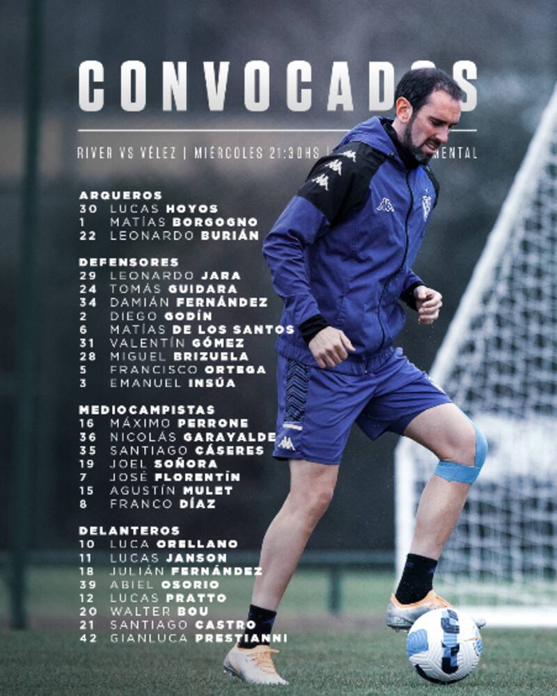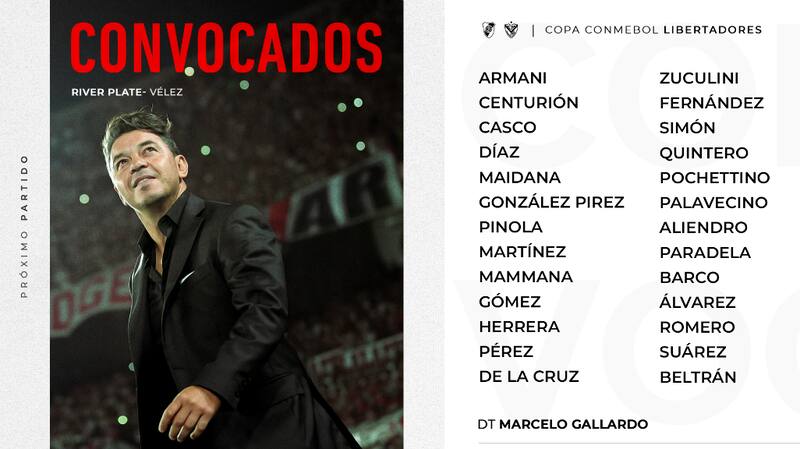 Esta tarde el Gallardo dio a conocer la lista de los convocados que enfrentarán a Vélez este miércoles en el Monumental. El director técnico citó a 26 jugadores para uno de los partidos más importantes del año.