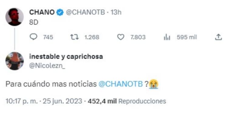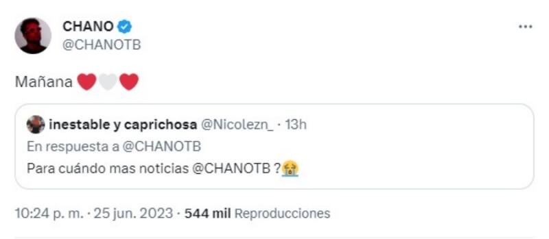 "Mañana", respondió Chano a la consulta de un seguidor sobre un primer tuit que decía "8D". De esa forma, comenzó la especulación, ya que la publicación dio lugar a dos pistas importantes.