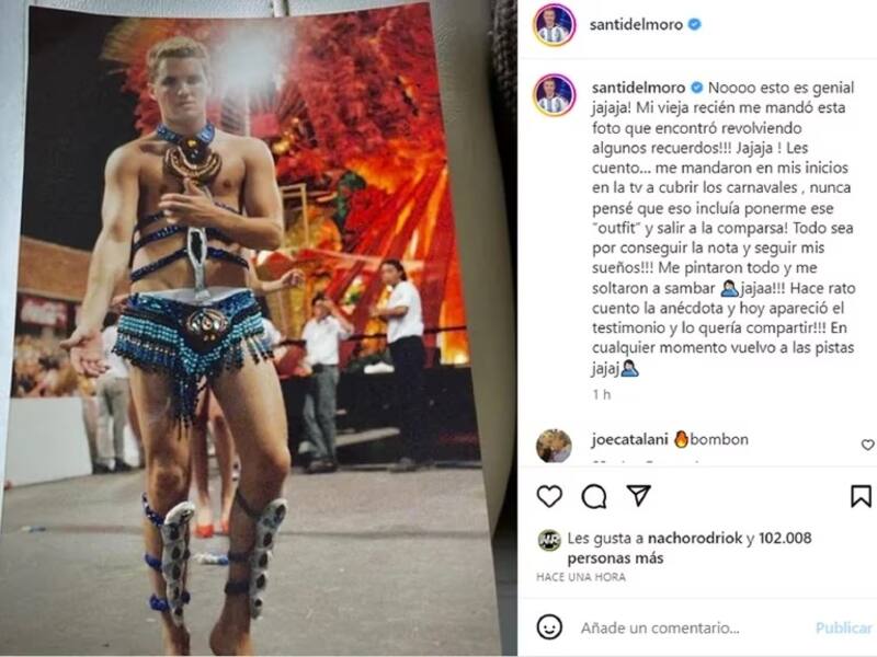 En este marco, explicó que en sus inicios en la televisión lo mandaron a cubrir los carnavales. "Nunca pensé que eso incluía ponerme ese "outfit" y salir a la comparsa", expresó Del Moro y agregó: "Todo sea por conseguir la nota y seguir mis sueños".