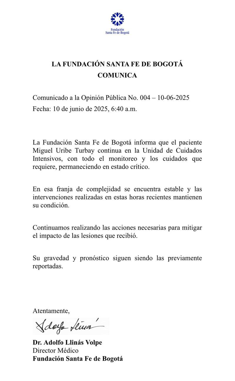 Según ese centro médico, "el paciente Miguel Uribe Turbay continúa en la Unidad de Cuidados Intensivos, con todo el monitoreo y los cuidados que requiere, permaneciendo en estado crítico".
