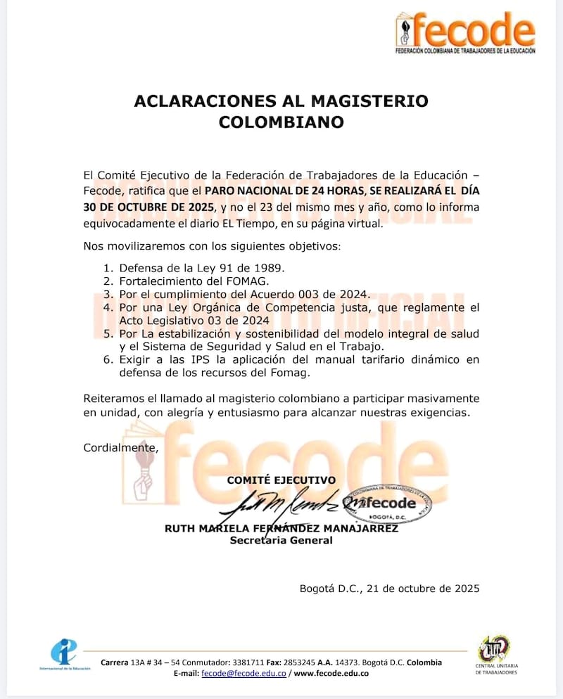 Este jueves 30 de octubre, Colombia vivirá una nueva jornada de protestas nacionales. La Federación Colombiana de Trabajadores de la Educación (Fecode) oficializó un paro docente de 24 horas, que incluirá marchas y concentraciones en las principales capitales.