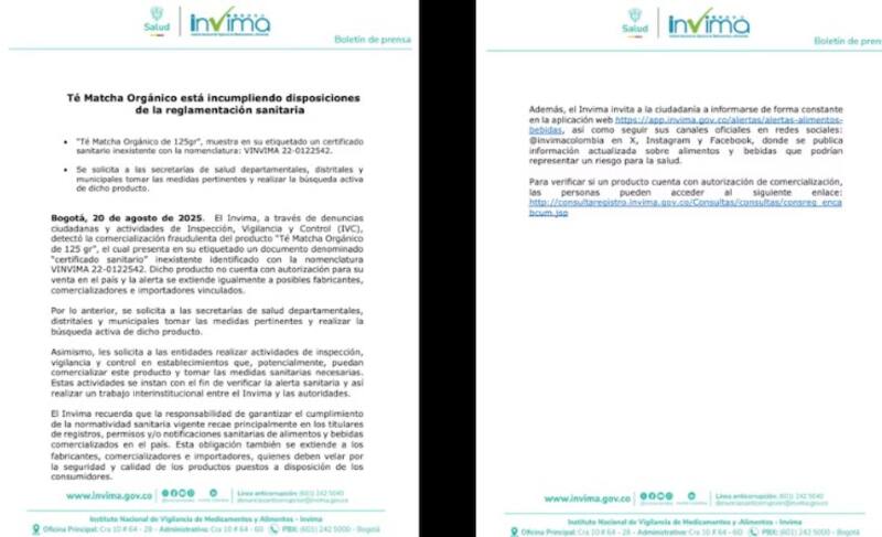 El Invima confirmó que el Té Matcha Orgánico presenta un certificado sanitario inexistente (VINVIMA 22-0122542) y carece de registro para su venta legal en el país. La autoridad recomendó a los consumidores no adquirir el producto y reportar su presencia en tiendas y supermercados.