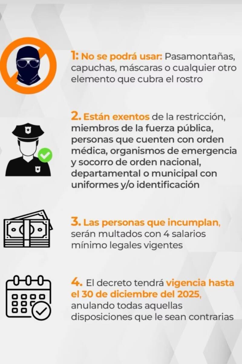 La vigencia de la medida estará hasta el 30 de diciembre de 2025. Además, las autoridades locales patrullarán el municipio para garantizar el cumplimiento del decreto y realizarán decomisos de cualquier objeto utilizado para ocultar el rostro de manera ilegal.
