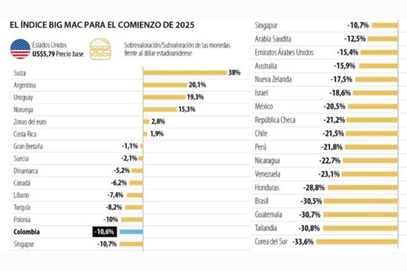 En 2024 Colombia apareció en el ranking con el octavo lugar, con el precio de la hamburguesa más barato entre las monedas subvaloradas.