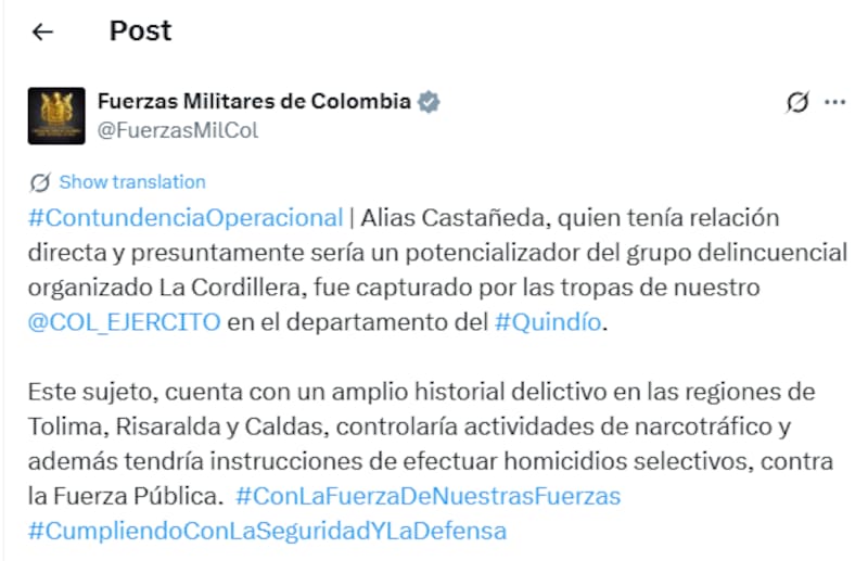 El operativo que permitió la captura de alias Castañeda se desarrolló en un contexto de intensificación de acciones de seguridad por parte del Ejército Nacional y la Policía, con el fin de disminuir la violencia asociada al narcotráfico y el crimen organizado en el Eje Cafetero.