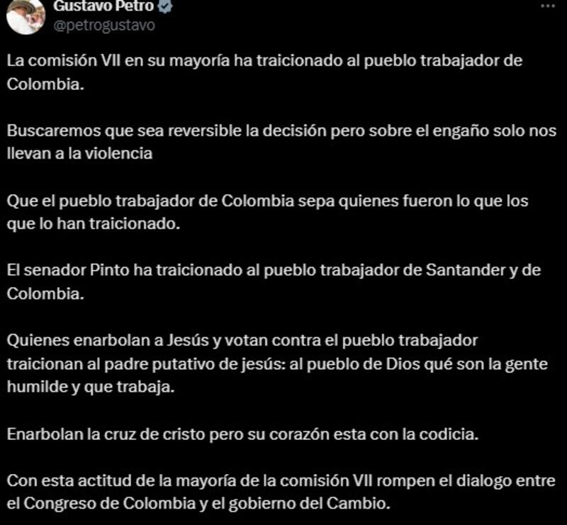"La comisión VII en su mayoría ha traicionado al pueblo trabajador de Colombia. Buscaremos que sea reversible la decisión, pero sobre el engaño solo nos llevan a la violencia", lanzó Petro a través de su cuenta de X.