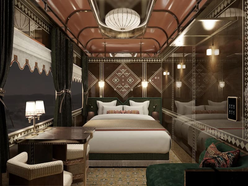 Los interiores se inspiran en el paisaje desértico: tonos arena, tallados en madera y luminarias de vidrio de Murano que evocan faroles orientales. Habrá un salón central tipo Majlis para socializar y dos coches restaurante con propuestas locales y menús de fusión italiana a nivel Michelin.