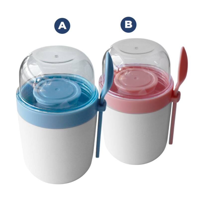 Al comprar el vaso este incluye una cuchara y un contenedor para salsas/vinagretas. El recipiente puede transportar hasta 400 ml en su taza principal, 280 ml en su taza superior y 65 ml en su taza de salsa.