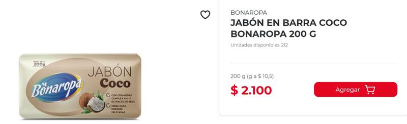Con un precio de apenas $2.100, el Jabón Bonaropa de Coco se vende en presentaciones de 200 gramos (a $10,5 por gramo) y puede encontrarse en la mayoría de Tiendas D1 del país. Además de su bajo costo, destaca por su fragancia tropical, su capacidad de limpieza y su cuidado de la ropa blanca y de color.