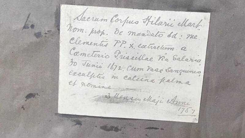 Dentro de la caja de madera, el profesional encontró una segunda caja adornada de color verde y rojo con varios sellos de cera roja, con otro sobre en la ventana, esta vez escrito en inglés. Cuando abrió el sobre, leyó las palabras "Reverendo John Augustine Grace, autenticación del cuerpo de San Hilario mártir, 1878 de Roma".