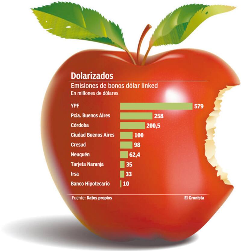 Por el lado de las empresas la situación de repite, pero en una escala superior: la proporción llega a casi uno de cada dos pesos emitidos de deuda en los últimos nueve meses. En este grupo, una compañía estatal juega un rol central. Se trata de YPF, que emitió ya u$s 579 millones en títulos dólar linked, equivalente al 75% del total de colocaciones de deuda de este tipo realizadas por las empresas. Curiosa política devenida de la principal firma estatal de un gobierno que hizo del rechazo a la dolarización una bandera de su política económica. Y promueve la pesificación, pese a que no combate la pérdida de valor de la moneda nacional, es decir la inflación.