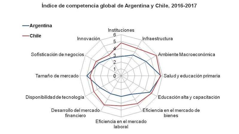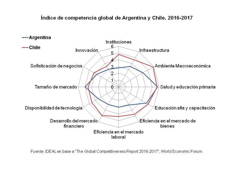 También se confirma la mayor competitividad de la economía chilena con el índice de competencia global, elaborado por WEF. Este índice muestra el desempeño de Argentina y Chile a través de 12 indicadores de competitividad, que toman valores entre 1 y 7 (1 menos competitivo y 7 más competitivo). Según este índice, Chile ocupa el puesto 33 de 144 países y Argentina el 104. Chile nos supera en 10 indicadores, ambiente macroeconómico; desarrollo del mercado financiero; instituciones; eficiencia en el mercado de bienes; eficiencia en el mercado laboral; infraestructura; y disponibilidad de tecnología, mientras que Argentina sólo se encuentra mejor en tamaño de mercado; y salud y educación primaria.