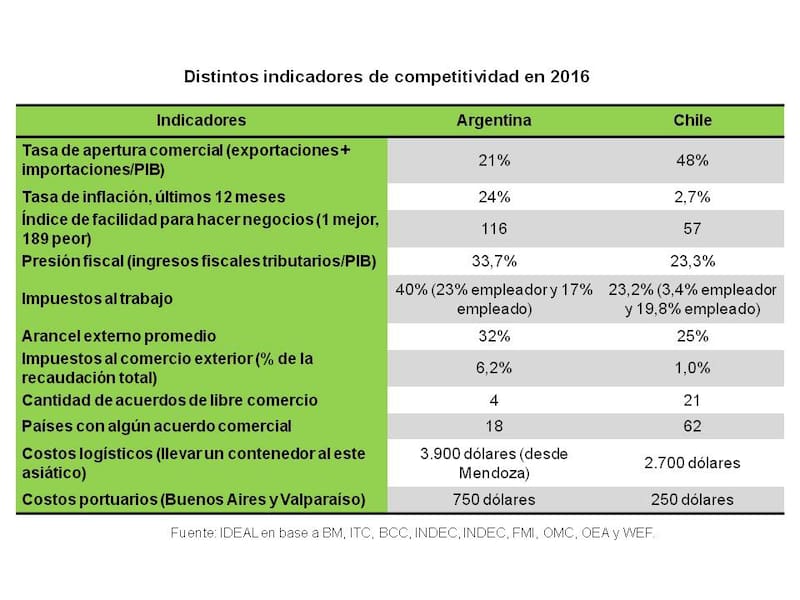 Si se comparan algunos indicadores de competitividad puede verse claramente como la Argentina se encuentra en desventaja a la hora de competir con Chile.