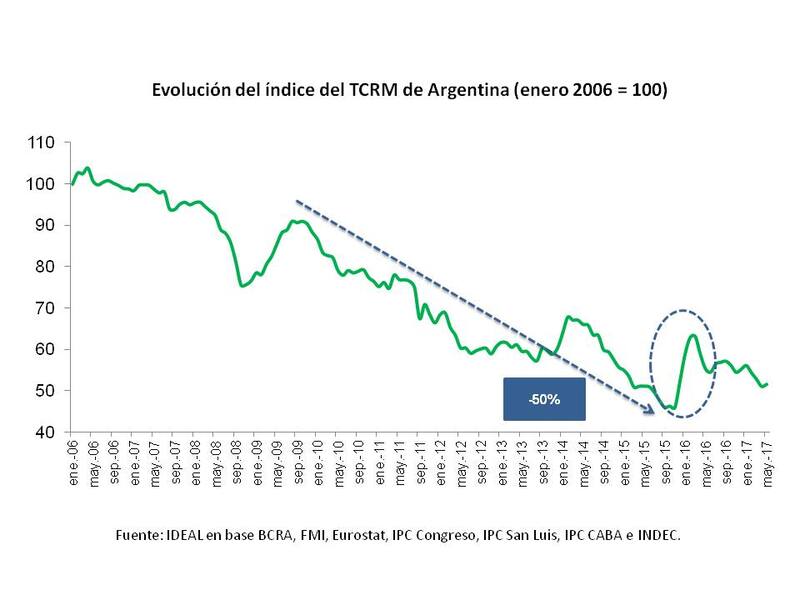 Con la salida del cepo cambiario en diciembre de 2015, se logró recuperar parte de esta competitividad perdida, y en 2016 el TCRM aumentó 15%, en promedio, con respecto al de 2015. Sin embargo, en los últimos meses ha vuelto a mostrar una tendencia declinante. Tal es así, que en los primeros cuatro meses de 2017 cayó 12% con respecto al mismo período del año anterior.