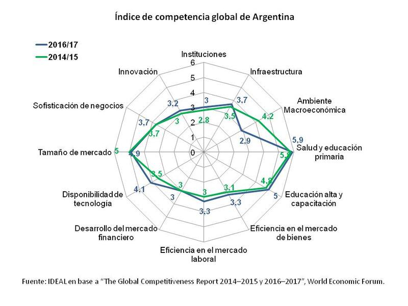 Este índice muestra el desempeño a través de 12 indicadores de competitividad, que toman valores entre 1 y 7 (1 menos competitivo y 7 más competitivo). Argentina se encuentra mejor posicionada en “tamaño de mercado (puesto 28), “educación alta y capacitación (40), “salud y educación primaria (63) y “disponibilidad de tecnología (69); mientras que sus mayores déficit son “eficiencia en el mercado de bienes (puesto 135), “eficiencia en el mercado laboral (130), “instituciones (130) y “ambiente macroeconómico (130).