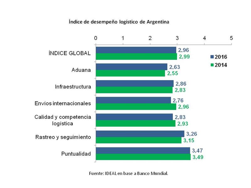De los 6 aspectos que considera este índice, Argentina logró mejorar en 3 entre 2014 y 2016. Mejoró su desempeño en “aduana (velocidad, simplicidad y previsibilidad de los trámites por parte de los organismos de control fronterizo), “infraestructura (calidad del comercio e infraestructura relacionada con el transporte) y “rastreo y seguimiento (capacidad en el rastreo y seguimiento de los envíos), y empeoró en “envíos internacionales (facilidad para organizar envíos a precios competitivos), “calidad y competencia logística (competencia y calidad de los servicios logísticos) y “puntualidad (puntualidad de los envíos para llegar al destino dentro del plazo de entrega previsto).