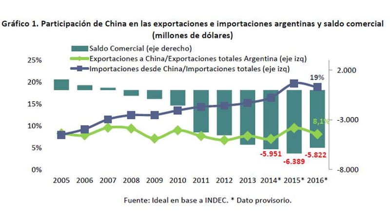 China es en la actualidad uno de los mayores socios comerciales de la Argentina, sólo por detrás de Brasil, tanto en exportaciones como en importaciones. Las exportaciones argentinas a China crecieron entre 2001 y 2011, pero a partir de allí comenzaron a caer y en 2016 se ubicaron en u$s 4661 millones. Las exportaciones a China representan el 8% del total exportado por Argentina. Las importaciones desde China se multiplicaron por 10 entre 2001 y 2011, pero luego se han mantenido relativamente estables. En 2016 se ubicaron en u$s 10.500 millones, lo que representa el 19% del total nacional. La balanza comercial, deficitaria para Argentina desde el año 2008, mostró en 2016 un saldo negativo de u$s 5800 millones.