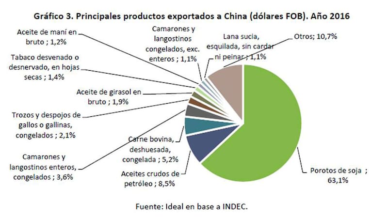Los productos que más vendimos a China en 2016 fueron esencialmente alimentos. Los más importantes fueron porotos de soja, que explicaron el 63% de las ventas a ese país. Muy por detrás se ubicaron aceite crudo de petróleo (8,5%); carne bovina deshuesada y congelada (5,2%); camarones y langostinos enteros y congelados (3,6%); trozos y despojos de gallo o gallina congelados (2,1%); aceite de girasol en bruto (1,9%); tabaco desvenado o desnervado en hojas secas (1,4%); aceite de maní en bruto (1,2%); camarones y langostinos congelados que no están enteros (1,1%); y lanas sucias esquiladas sin cardar ni peinar (1,1%).