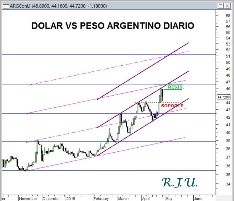 Según se puede observar, tras la escalada alcista de los precios hacia niveles máximos de 46.5 pesos, se originó un fuerte recorte del dólar que testea la zona de 44 pesos como principal contención de corto plazo.