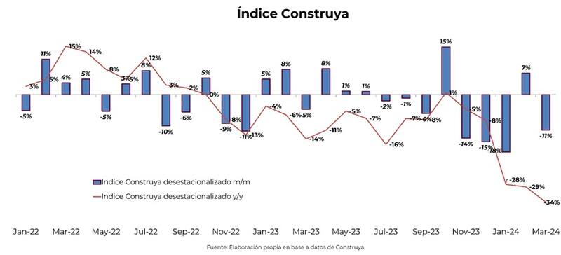Otro indicador clave en la construcción es el volumen de despachos de cemento Portland elaborado por la Asociación de Fabricantes de cemento portland (AFCP). Estos reflejaron una contracción del 42,9% en comparación con marzo de 2023 y del 7,2% respecto al mes anterior, marcando el quinto mes consecutivo de contracción y señalando un periodo de recesión.