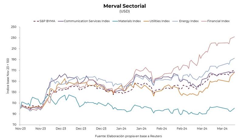 En el ámbito de los mercados financieros, se observa que el sector de materiales, compuesto principalmente por empresas cementeras como Holcim y Loma, así como la fabricación de acero como Ternium, experimentó una caída del 9% en dólares, frente a un Merval que ha subido un 23% y a las financieras, con un alza del 60%. Esto muestra que las empresas de este sector se encuentran rezagadas con respecto al resto.