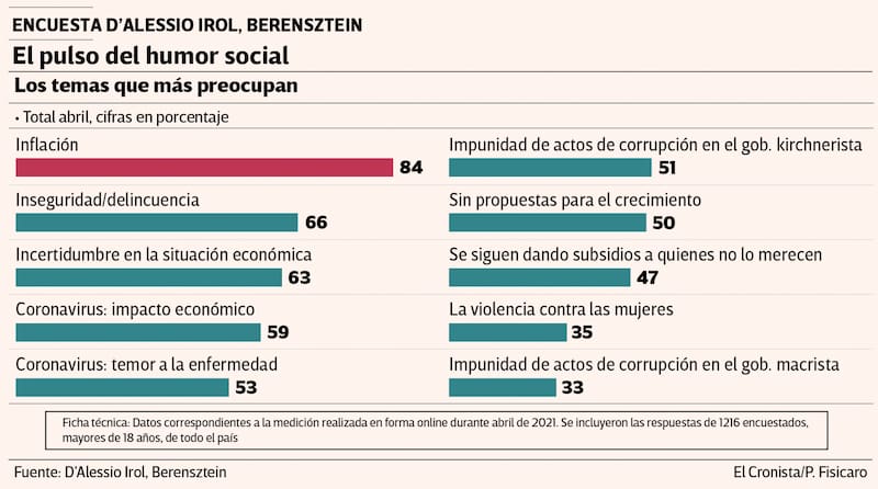 Porque más allá de las diferencias de pensamiento político, hay preocupaciones e intereses comunes a la mayor parte de la sociedad. La inflación, claramente, es la principal de ellas, según muestran todas las encuestas. La inseguridad, la incertidumbre sobre el futuro económico, el impacto de la pandemia y el temor al contagio del coronavirus se suman en esa lista, en la que vacunarse pasó a ser también una necesidad compartida, como siempre lo fue la erradicación de lapobreza, la formación educativa y la protección general de la salud.