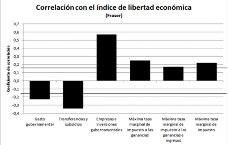 Lo que es más, al revisar la correlación de los subíndices que componen el indicador mayor (los que se expresaron antes), se nota que hay algunos que no solo tienen una correlación baja; sino que correlacionan negativamente con un mejor puntaje de libertad económica. En otras palabras, tanto el gasto estatal como las transferencias y los subsidios predicen una economía más libre.