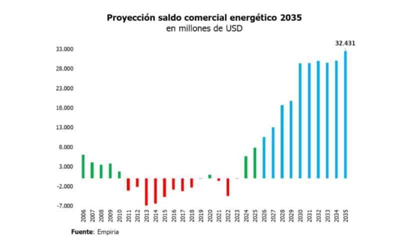Desde Empiria, nuestras estimaciones apuntan en la misma dirección: proyectamos un saldo comercial energético positivo de u$s 32.431 millones para 2035, casi cinco veces el nivel actual, con un precio del crudo de largo plazo estabilizado en u$s 73 por barril.