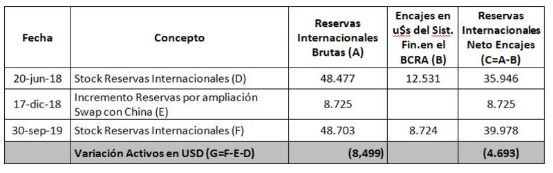 Por su parte, el análisis técnico correcto no sólo debe considerar lo que ocurrió con los pasivos en moneda extranjera sino también la evolución de los activos en dólares, esto es, las reservas internacionales. Siguiendo la línea argumental de los economistas de la pasada gestión, los desembolsos del FMI que no se emplearon para cancelar deuda deberían haber tenido como correlato un incremento en las reservas internacionales. Concretamente, si estas hubiesen subido en u$s 19.845 millones (lo que aumentaron los pasivos), el patrimonio neto en dólares no habría cambiado y las afirmaciones realizadas por las autoridades económicas anteriores hubiesen estado respaldadas por los datos.