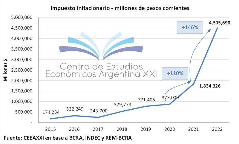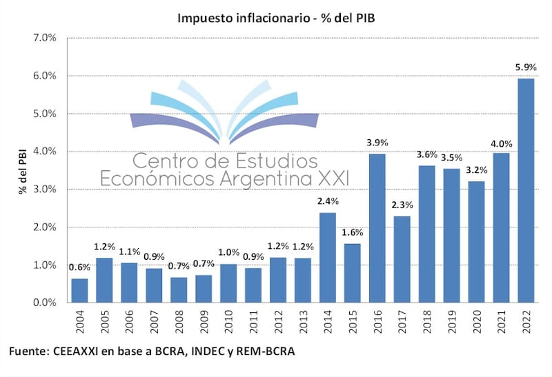 Durante 2022, el guarismo alcanzó el máximo desde el comienzo de la serie en 2004, y habría que remontarse a la década del '80 a fin de estimar si ha alcanzado un valor similar. De esta forma, el gobierno, por el simple hecho de contar con el monopolio de la emisión monetaria, se apropió de 5,9 puntos del PIB, casi 2 pungos por encima del 2021, año en el que había llegado al máximo previo.