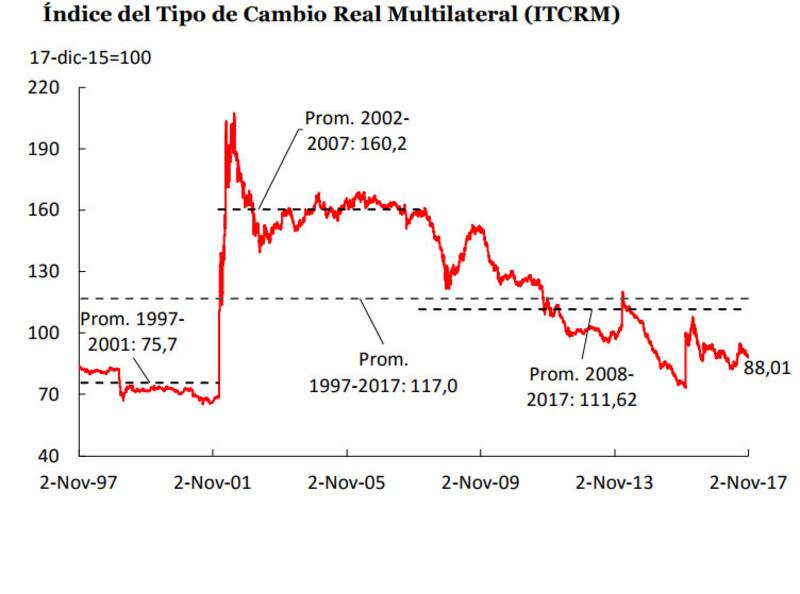 Entiendo que la mejor herramienta para analizar el valor del dólar es el índice de tipo de cambio multilateral que publica el BCRA. Este es un índice que compara los precios de nuestra economía con los precios de nuestros principales socios comerciales. Es un indicador respecto de cuan caro o barato es el país. En el informe sobre el tipo de cambio multilateral de Noviembre de 2017 del BCRA se publica el gráfico que reproduzco a continuación.