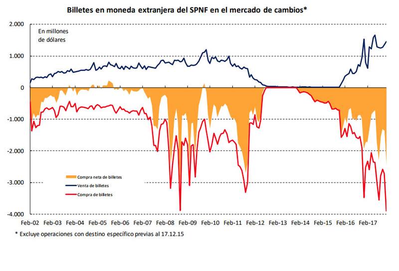 - La compra de dólares neta de residentes (formación de activos externos) alcanzó los u$s 15.708 millones durante el año 2017. El siguiente cuadro, incluido en el informe del BCRA, ilustra como el año 2017 fue un año de fuerte dolarización aunque inferior al año 2011 antes del cepo y al período 2008/2009, de fuerte incertidumbre por la crisis internacional. El área sombrada presenta el total de compras netas de billetes.