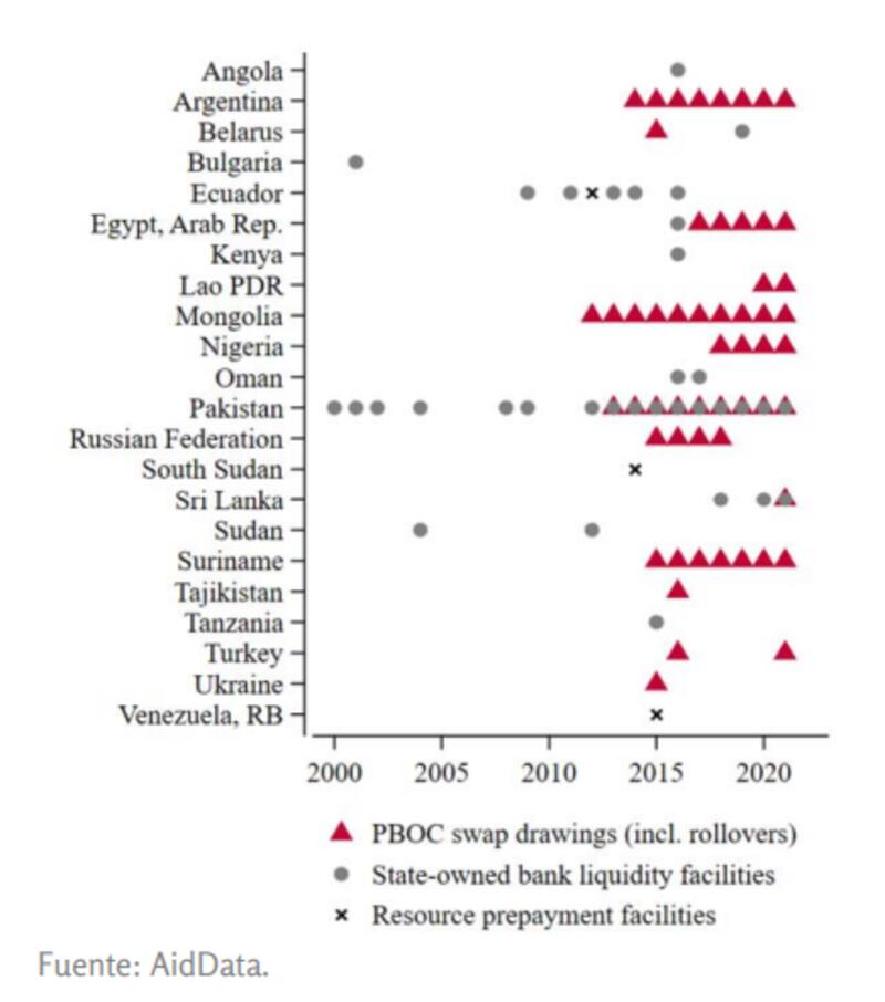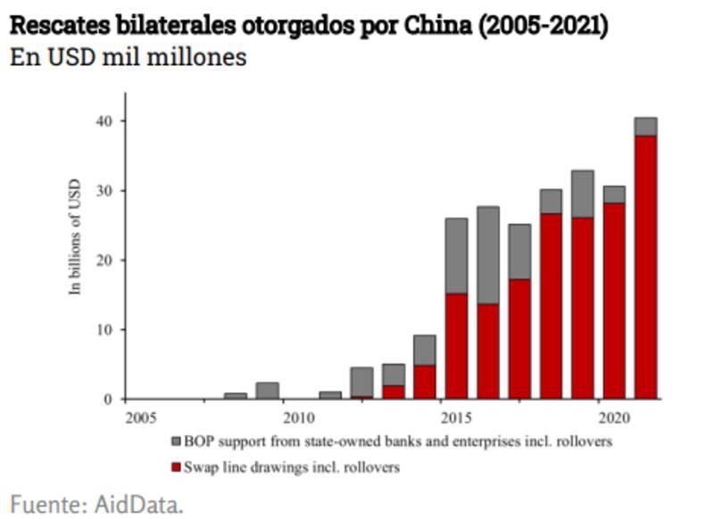 "Estos se dan principalmente a través de dos instrumentos: 1) Apoyo a las balanzas de pagos por medio de la red de swaps de monedas del Banco Popular de China; y 2) Apoyo de liquidez vía préstamos y depósitos de bancos estatales chinos y empresas chinas vinculadas al sector de commodities".