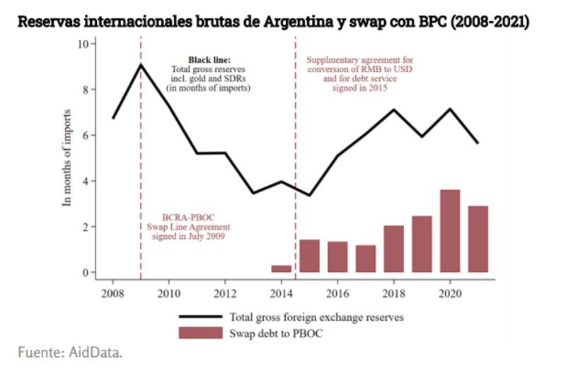 En el caso de Argentina, señala que el swap de monedas entre el Banco Central de la República Argentina y el Banco Popular de China en el contexto de reservas internacionales bajas, en diciembre de 2021 llegó a representar el 51% de las reservas brutas, reseñó.