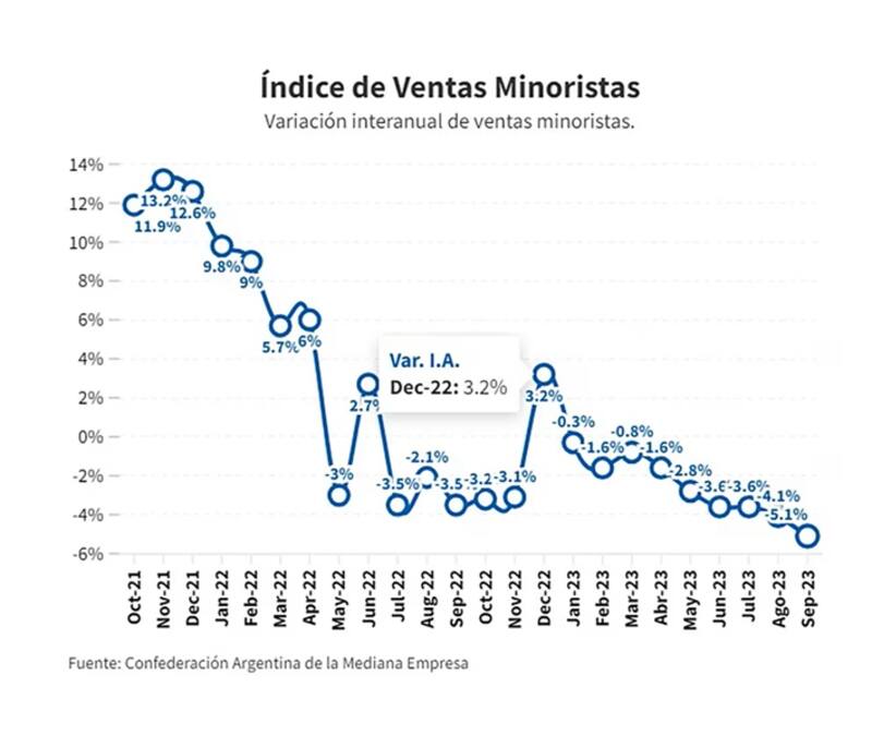Hoy se debe concentrar esfuerzos en ver cómo se ajusta a la realidad. Los precios internacionales a los que está vendiendo Argentina están por debajo del costo de producción estimado, aproximadamente, en U$S 3600 la tonelada de leche en polvo. Para que sea rentable, debería exportarse por encima de U$S 4000 la tonelada de leche entera y a U$S3700 la descremada. En simultáneo, el mercado doméstico mostró en septiembre la mayor baja en las ventas minoristas desde que la Confederación Argentina de la Mediana Empresa (CAME) realiza sus mediciones, hace ya 23 meses y que evidencia con bastante certeza lo que ocurre en la comercialización de lácteos. Las ventas minoristas de las pequeñas y medianas empresas (pymes) cayeron 5,1% en septiembre en comparación con el mismo mes del año anterior. Pero, además, ésta fue la novena baja consecutiva, por lo que el declive que muchos intuyen se evidencia claramente en estos números.