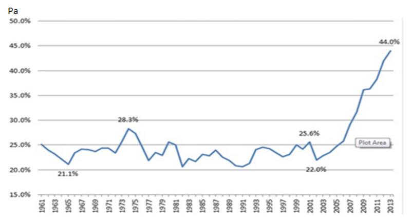 Figura No. 2: Gasto público argentino como % del PBI, 1961-2013